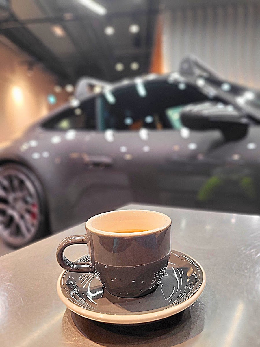As soon as you step inside, you are greeted by an ambiance that elegantly blends style and comfort, featuring designer furniture and a showroom filled with the latest Porsche models. The space is designed to not just serve as a café, but as an immersive environment where car enthusiasts and coffee connoisseurs can connect and indulge.